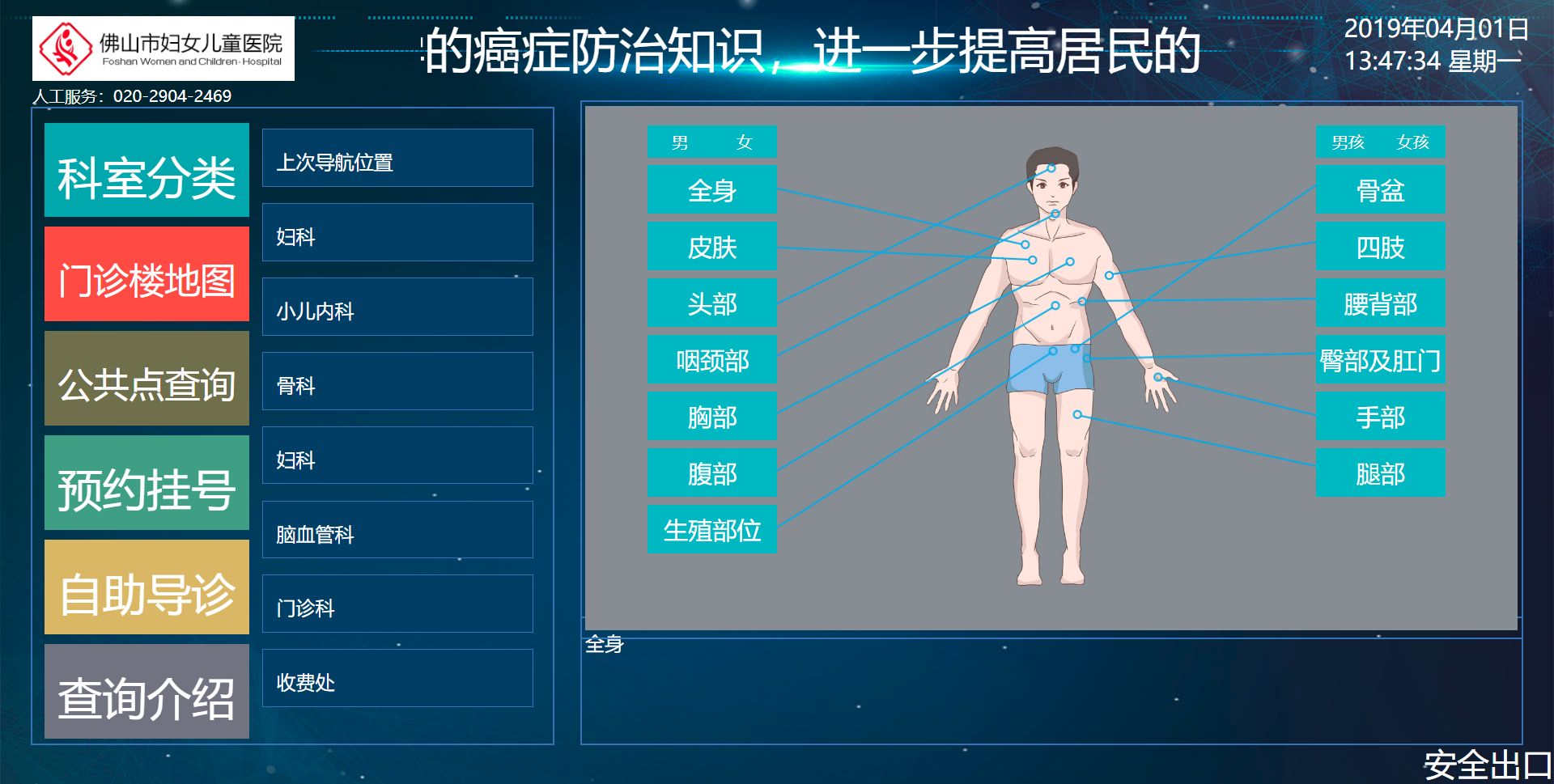 機器人通過語音提示指引患者查詢需要就診的科室,例如:患者頭痛,機器人會通語音提示患者按相應的操作,進一步判斷需要就診的科室,并且顯示圖文介紹和語音提示。 同時彈出醫院掛號的微信二維碼,方便患者輕松掛號。