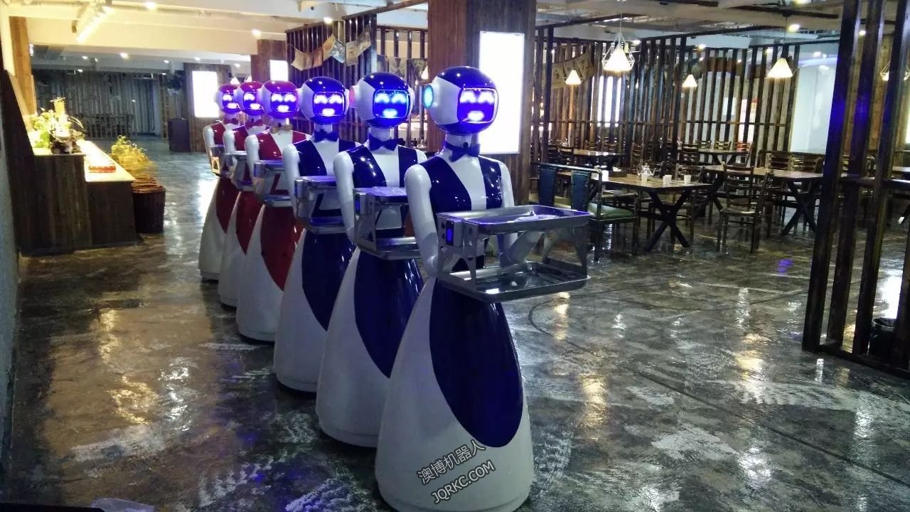 圖為一家采用澳博餐廳機器人的餐廳,6臺澳博餐廳機器人可以同時送餐服務,減少人力投入降低成本,還能與客人互動,增加餐廳整體氛圍,吸引更多人氣。
